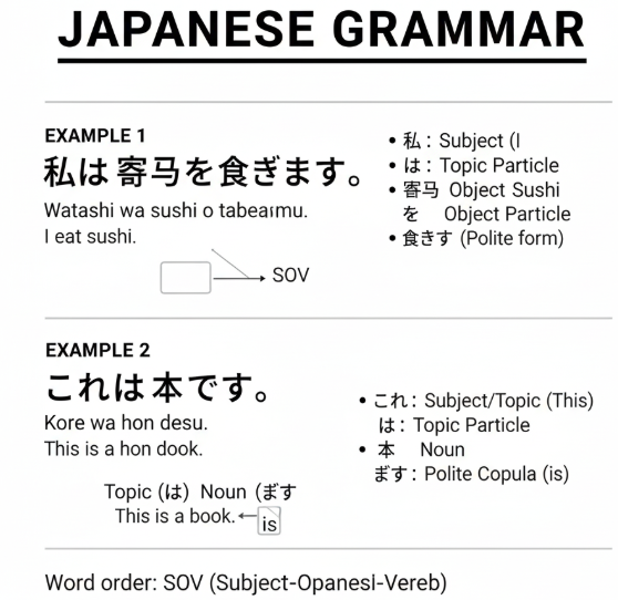 - To learn about basic sentence formation, it is important to note that in Japanese, they portray a sentence as subject-object-verb.